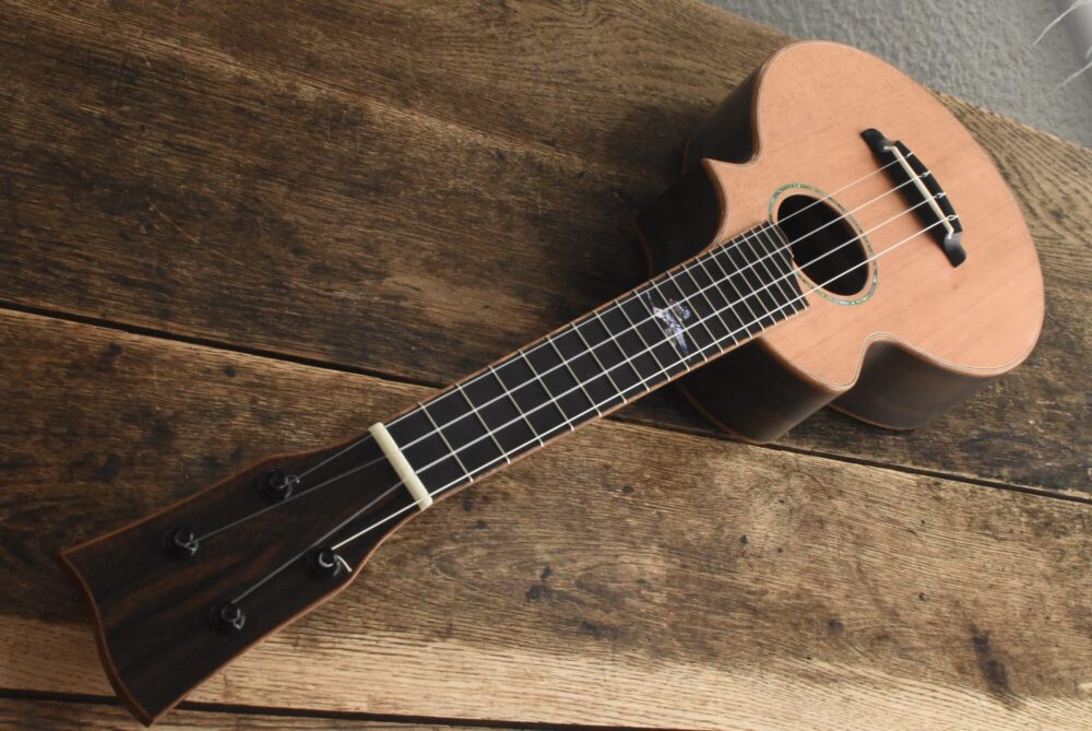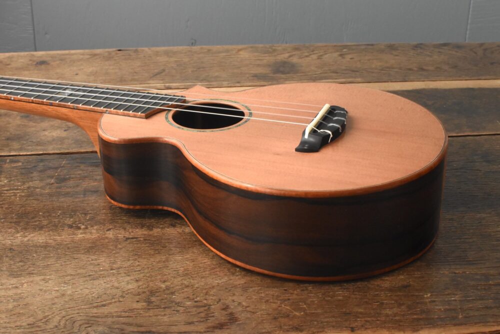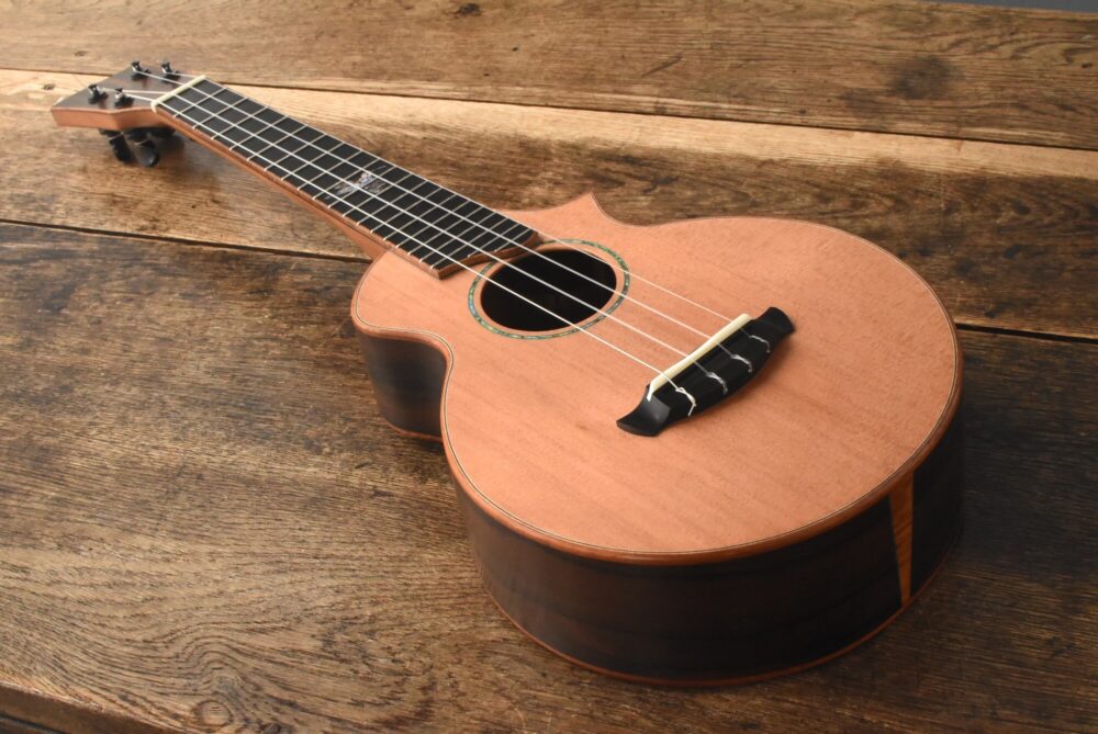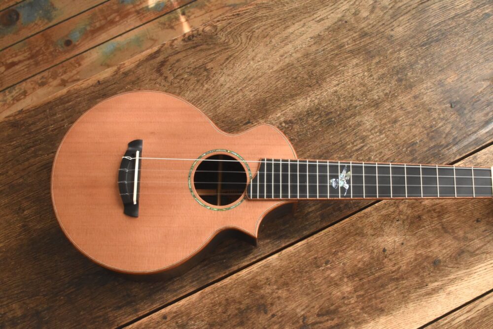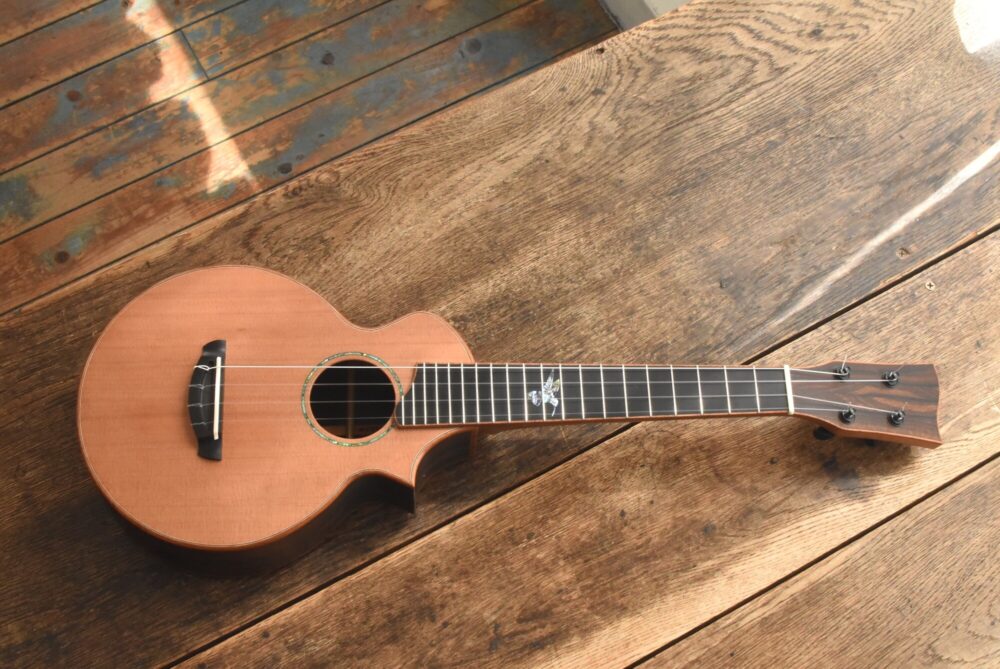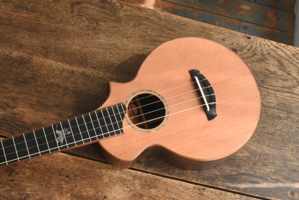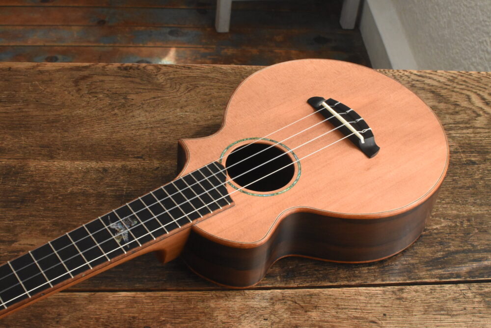 サイズはコンサート、独特の丸みを帯びたボディシェイプが特徴です 今作はカッタウェイシェイプに珍しい丸いサウンドホール仕様