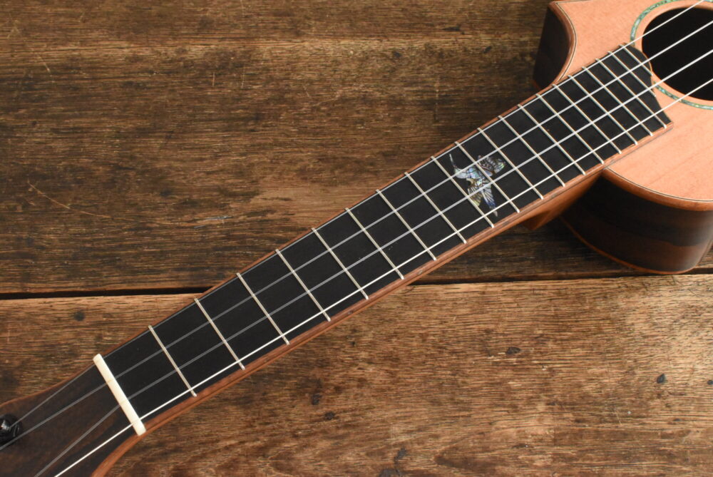 エボニー指板にはNaturelのロゴマークでもあるハチドリインレイ ボディのみならず指板にもハワイアンコアバインディング サイドのドットポジションマークもアヴァロン貝を用いています