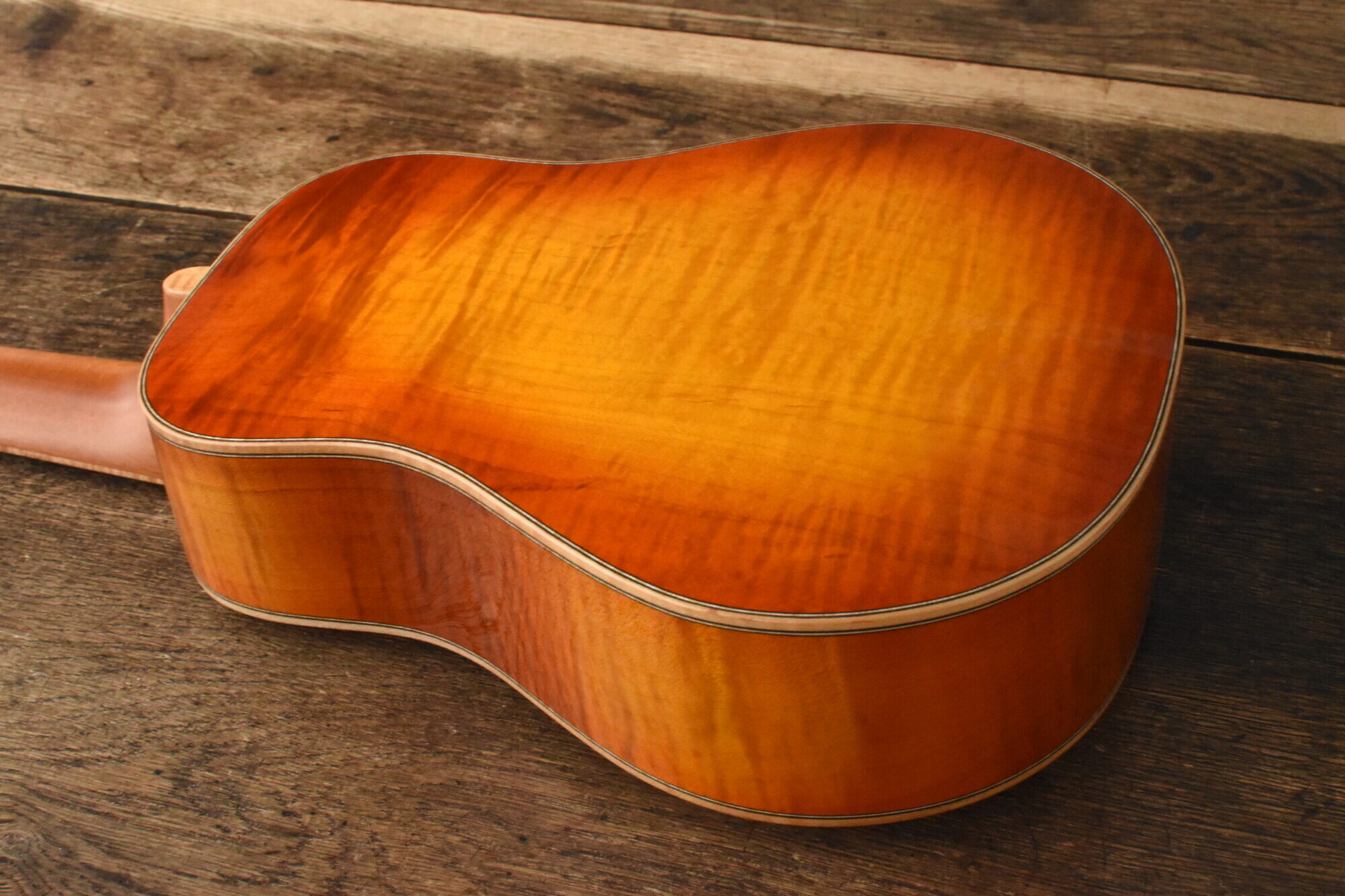 ボディトップにはシトカスプルース、バック&サイドにはカーリーメイプルを使用。バックのメイプルは1ピース材を用い、美しいバーストのカラーリングと見事な杢が相まった大変美しいボディが特徴です。ホンジュラスマホガニーネック、ブリッジ&指板にはブラジリアンローズウッドを使用しています。