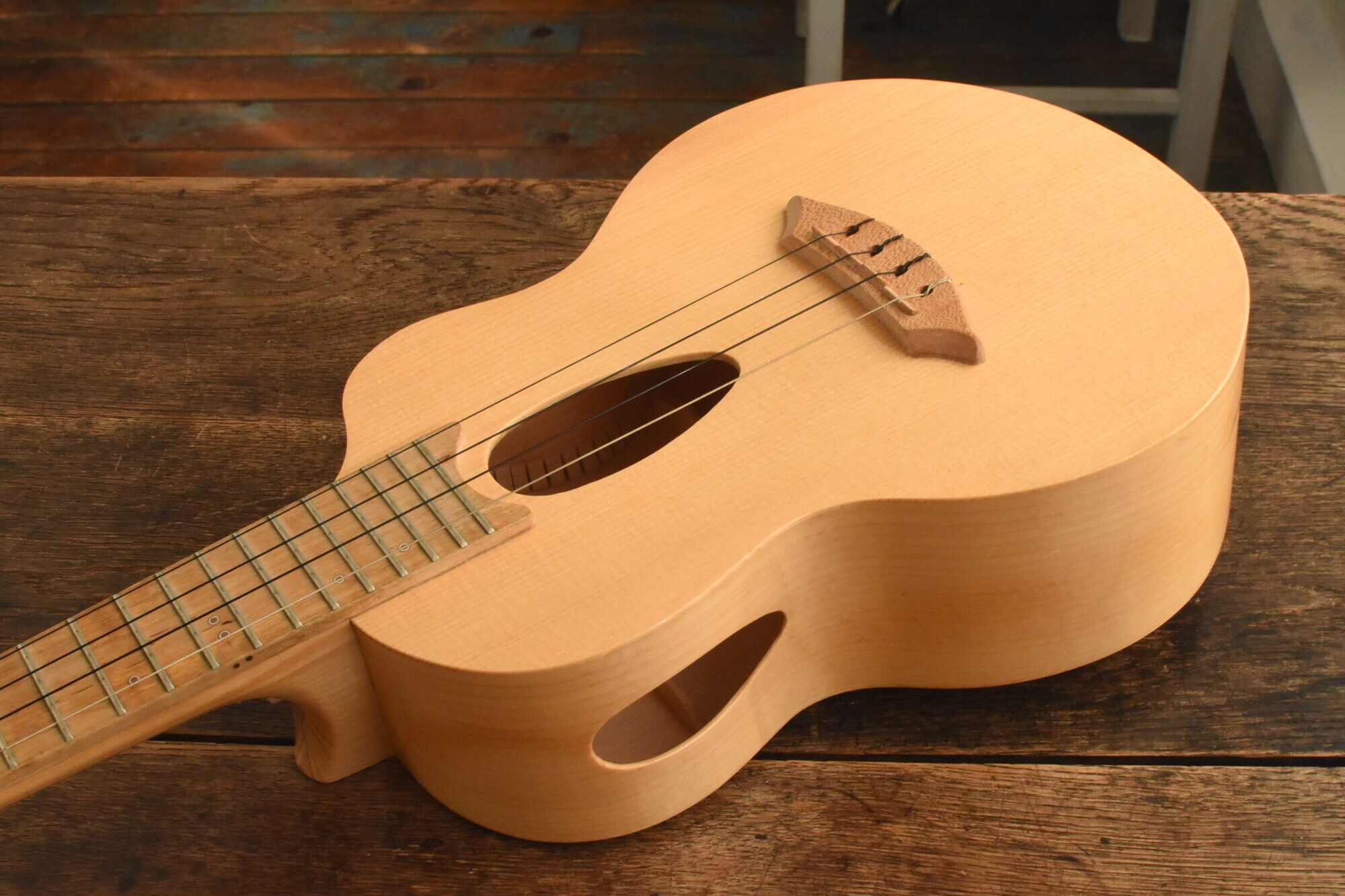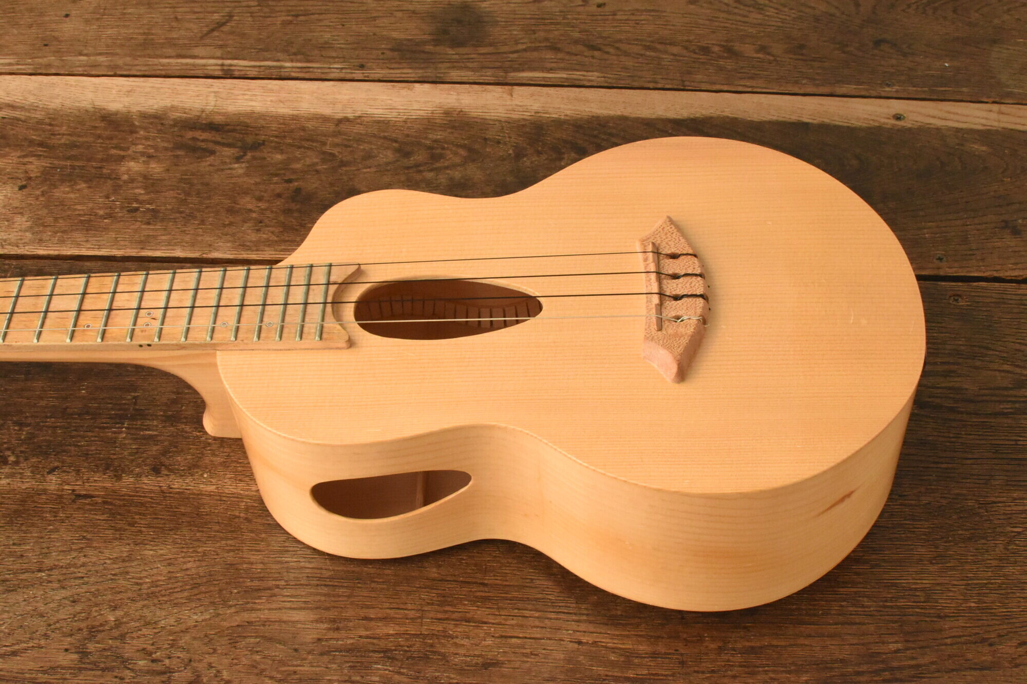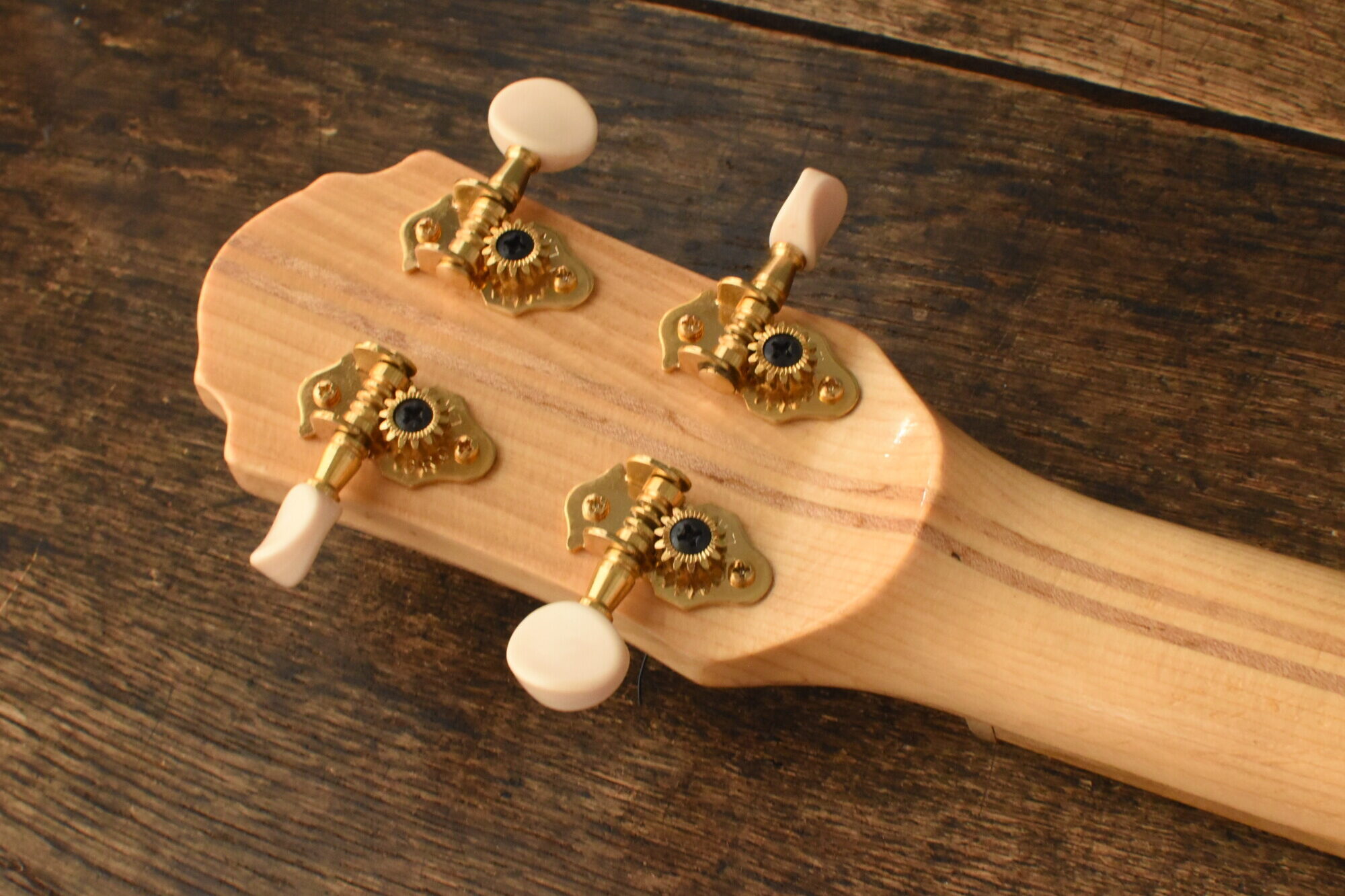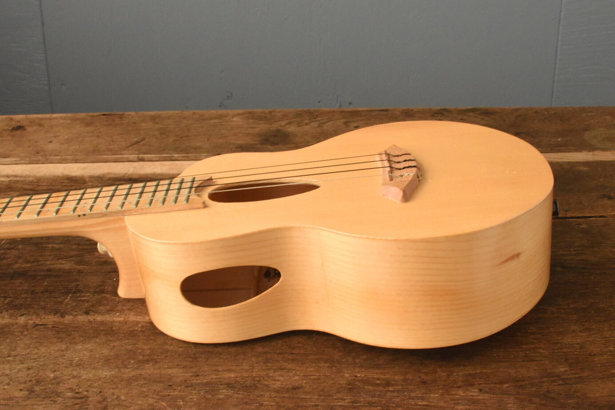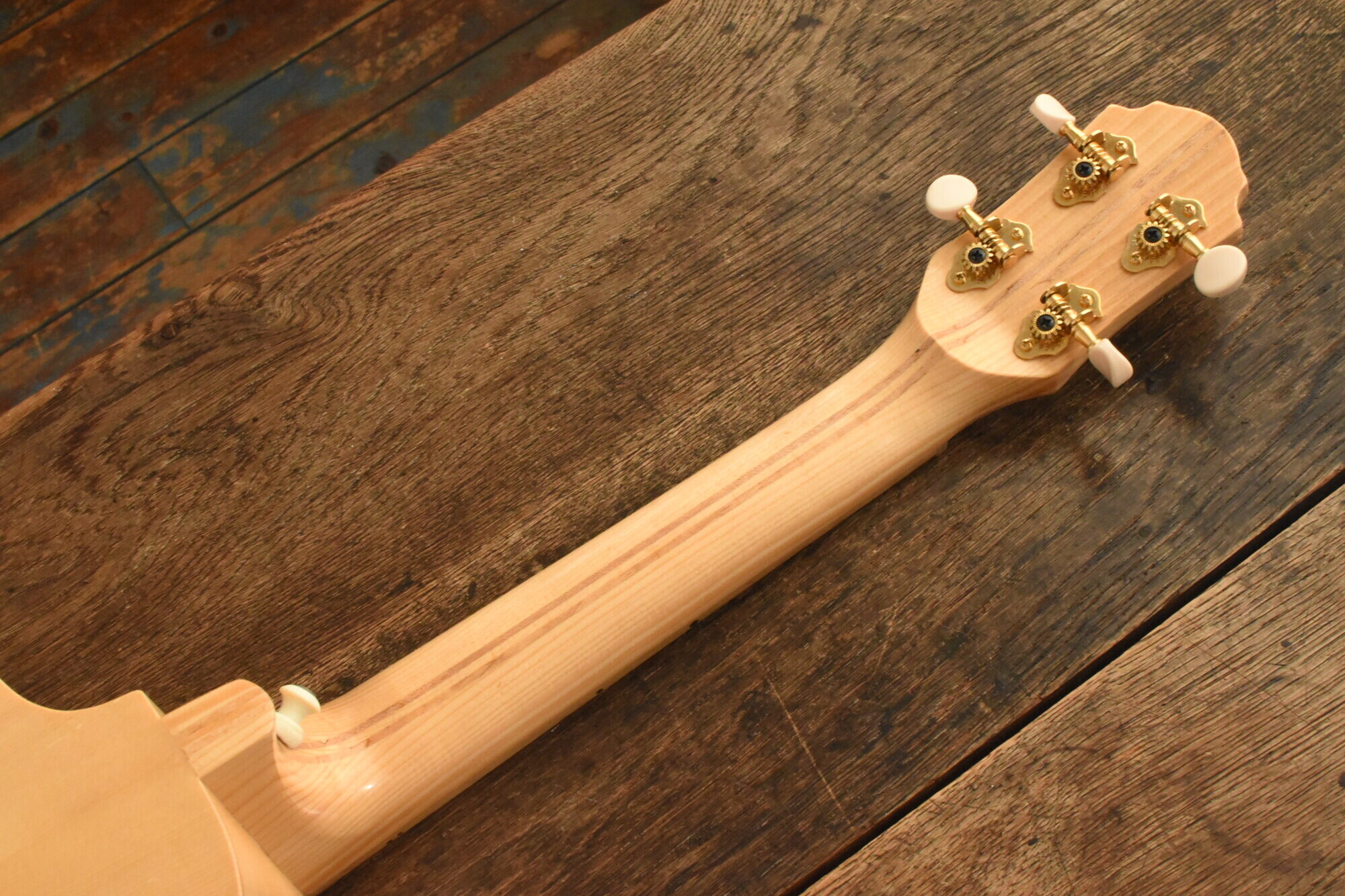 ボディ&ネックには北海道産のクロエゾマツを使用。現行モデルはネックとボディが一体整形のスルーネック構造を採用していますが、本器は一般的なウクレレ同様、ネックがボディにジョイントされる構造となっております。ボディ厚はくびれ部で約8.2cmと厚めのサイズが特徴です。指板&ブリッジにはイタヤカエデを使用しています。