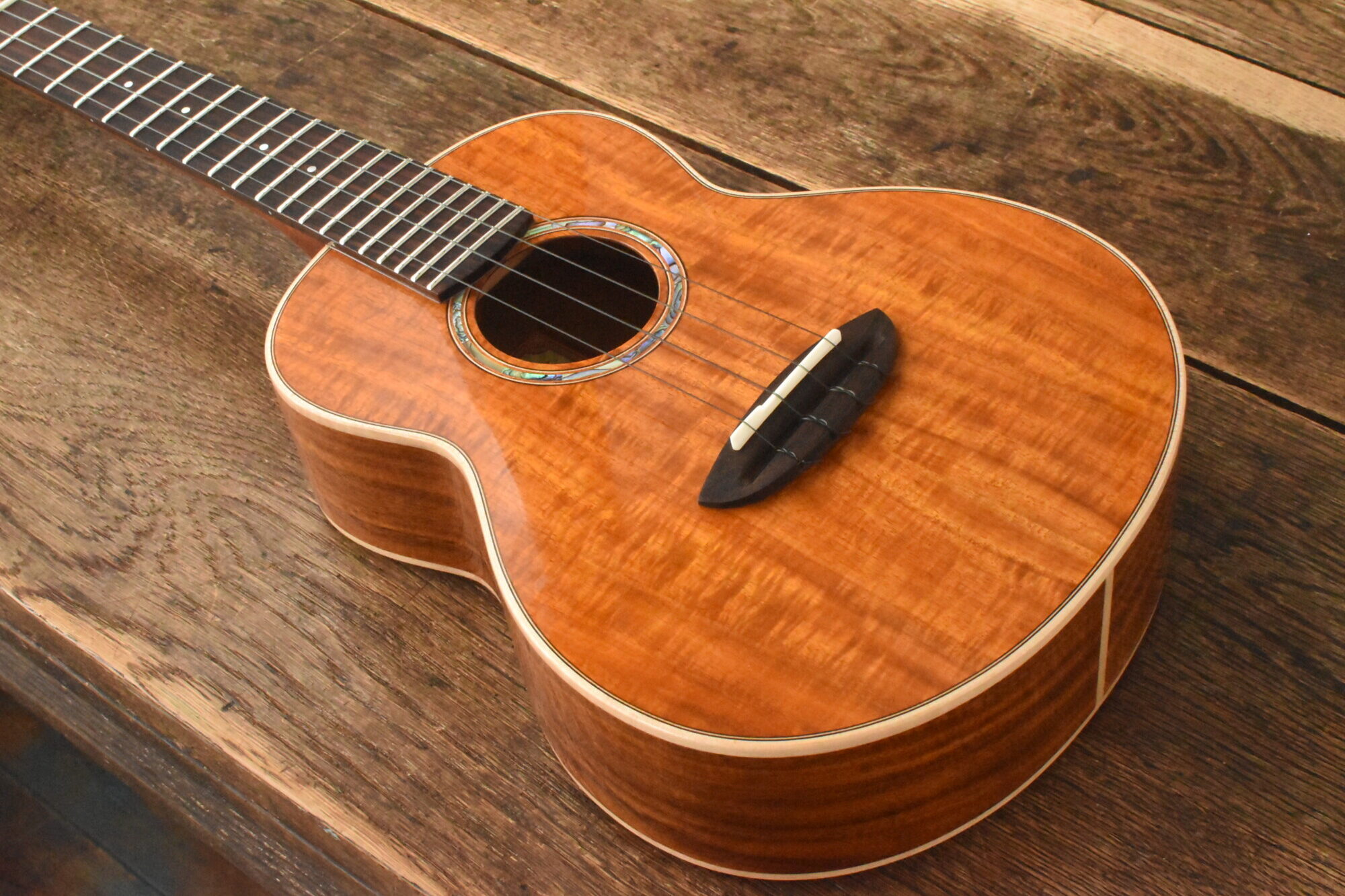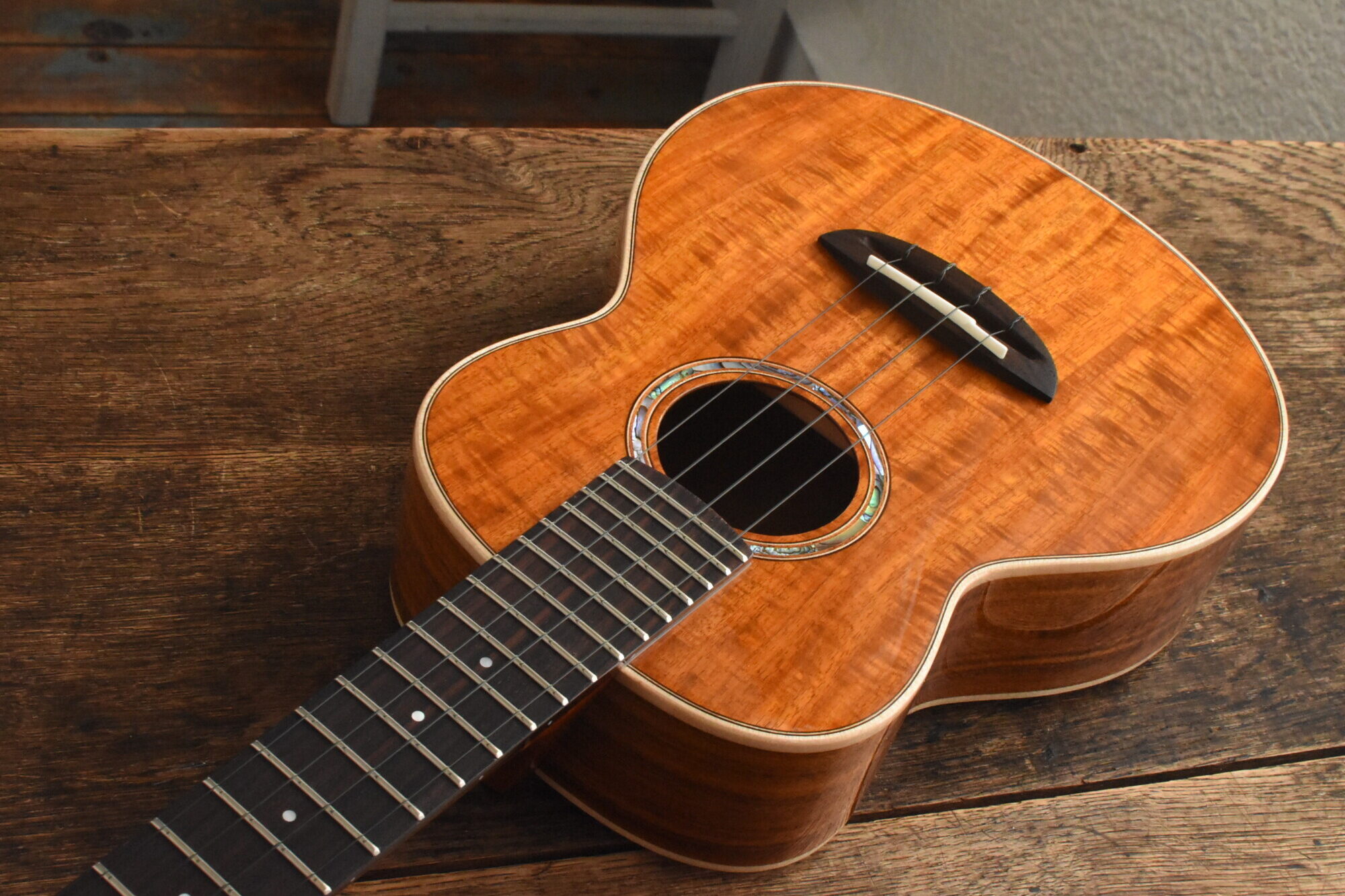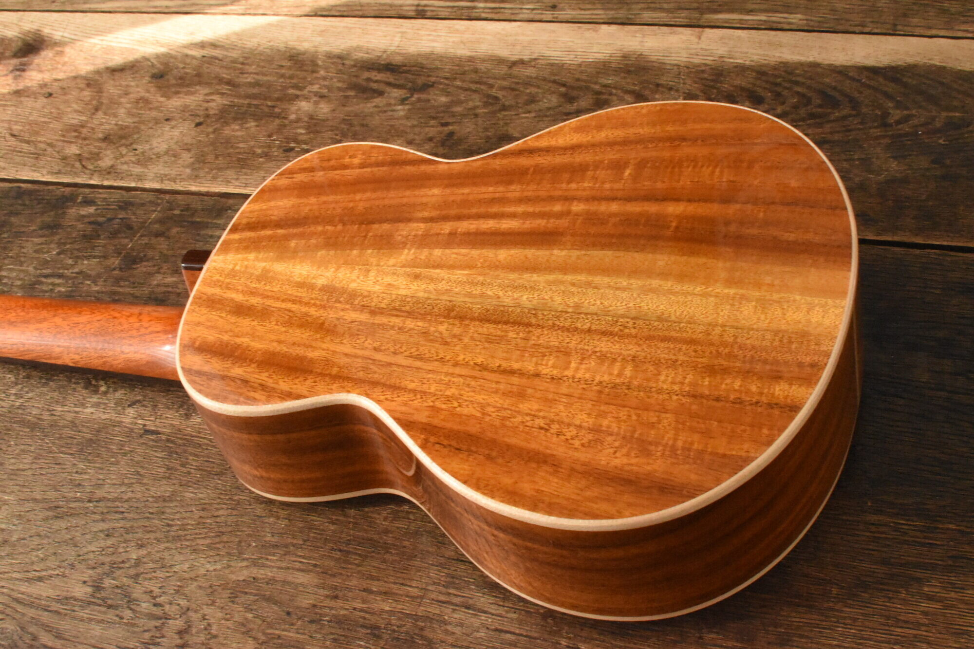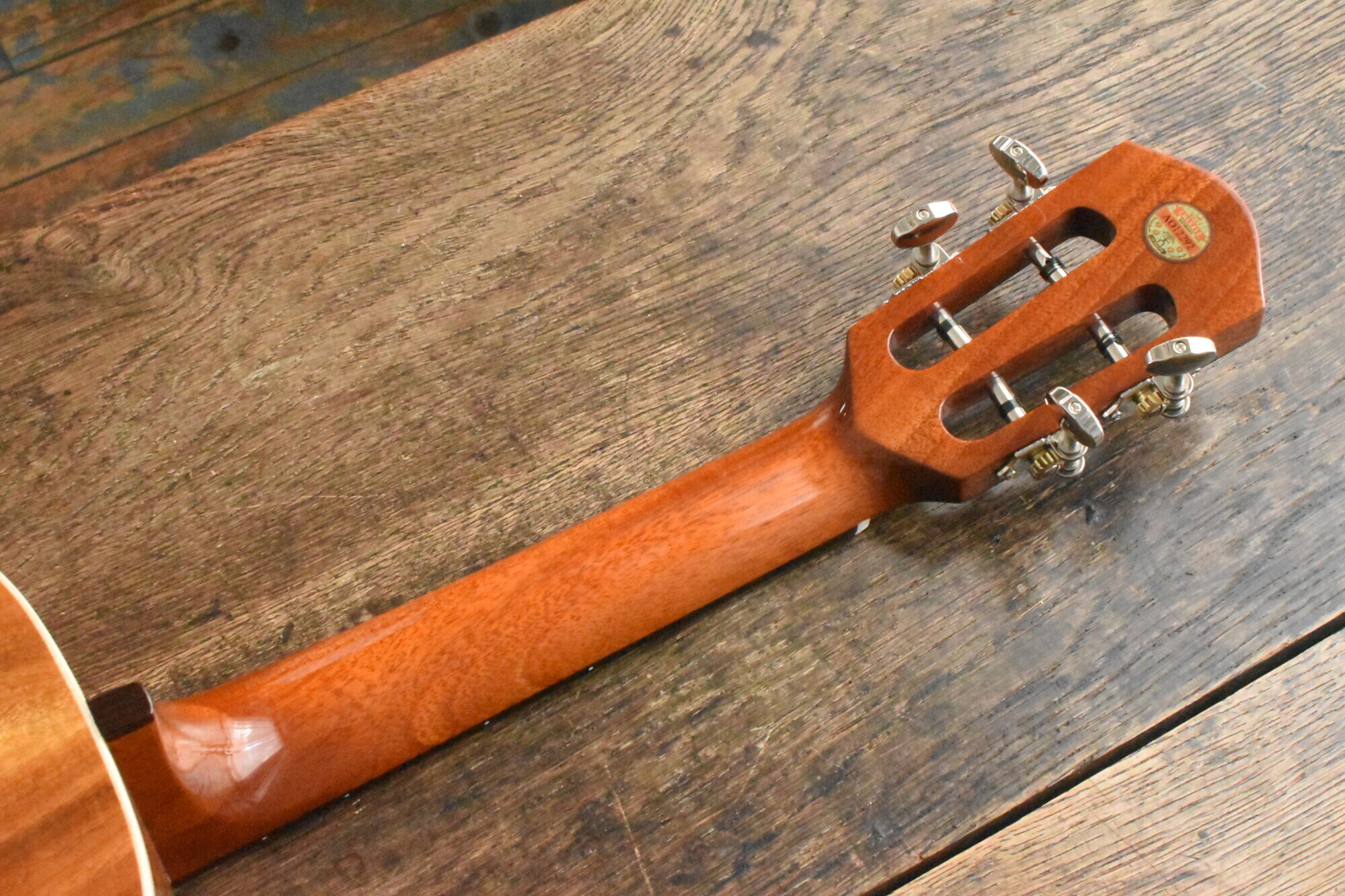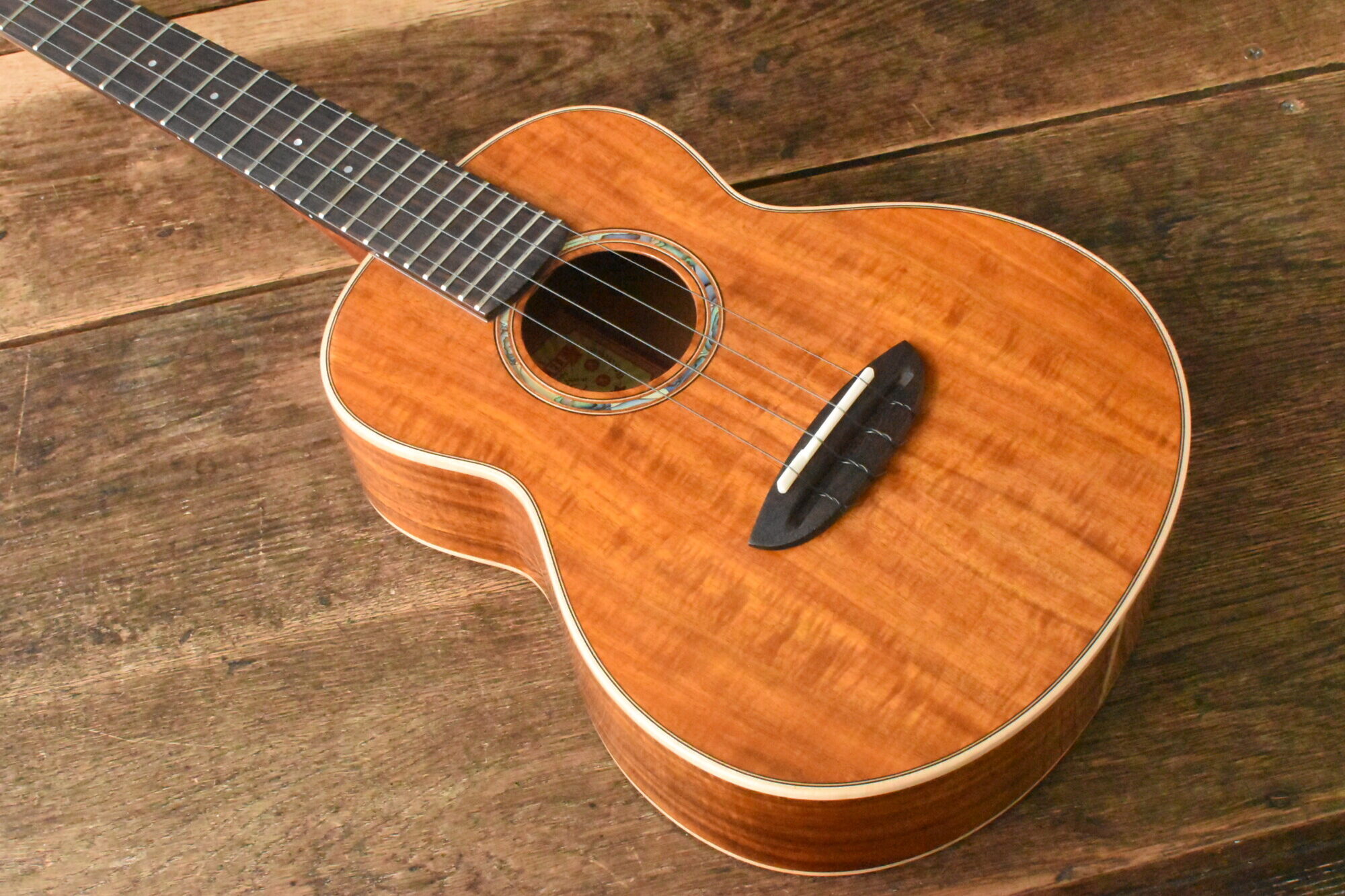 ボディには綺麗な木目と赤褐色の美しい色が特徴の台湾アカシア単板を使用。ローズウッド指板&ブリッジ。マホガニーネック。