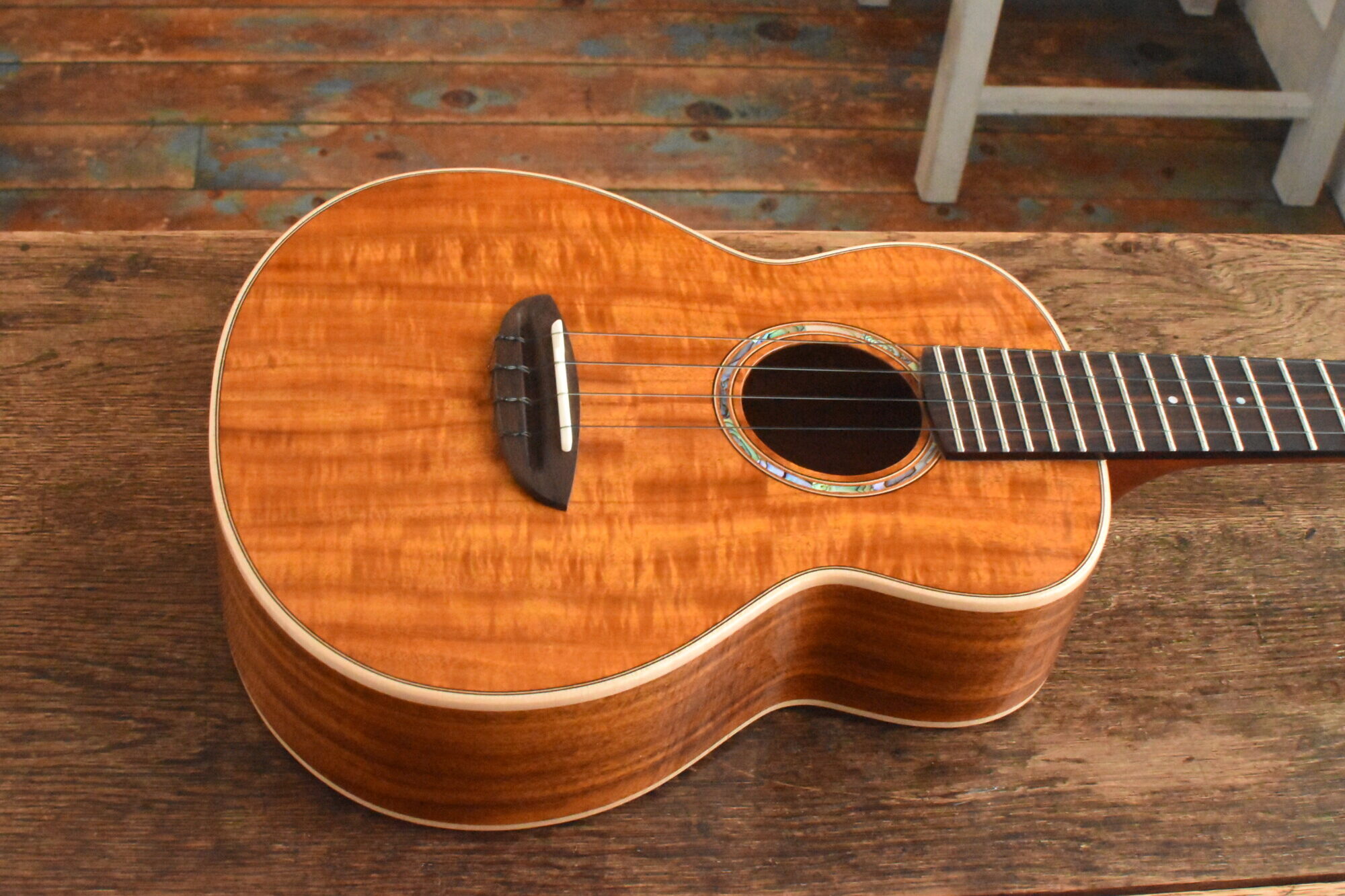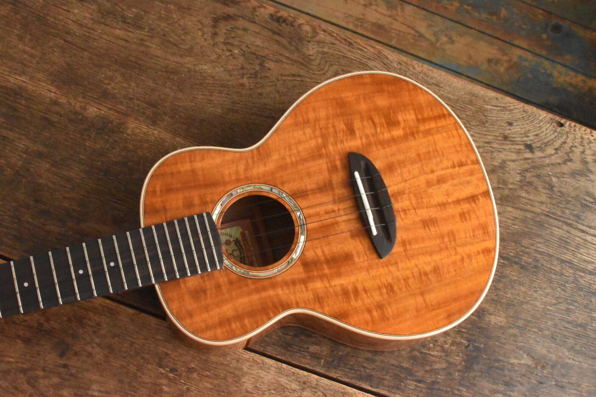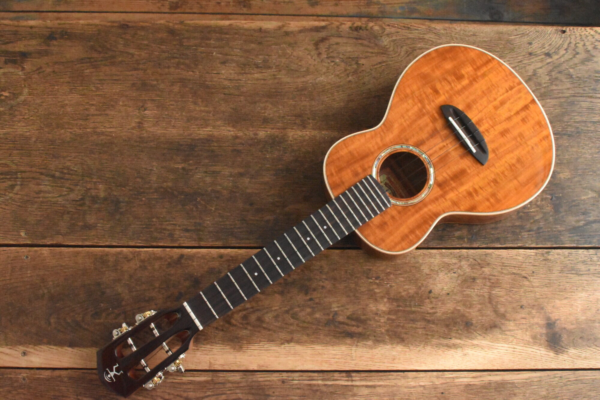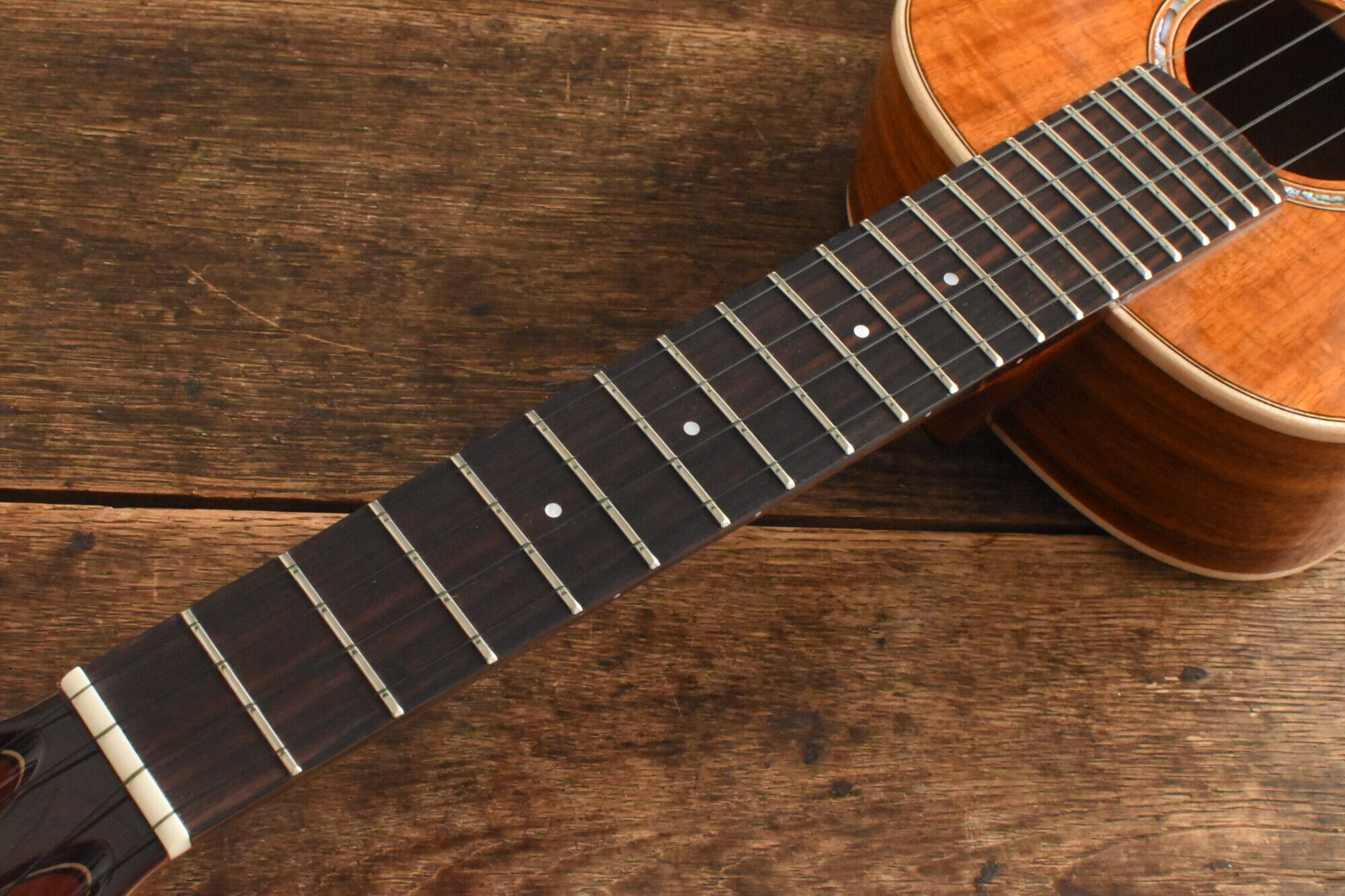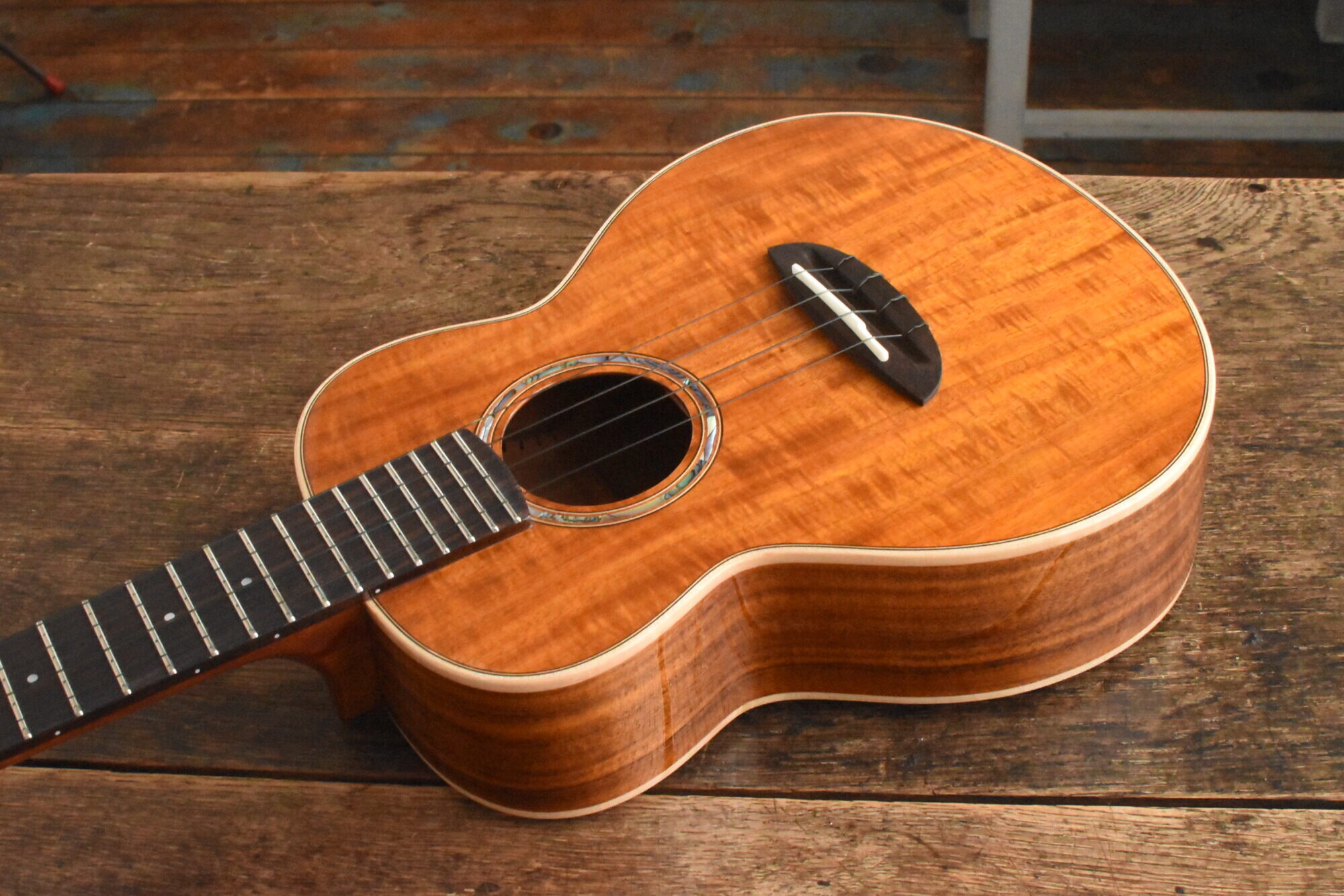 ボディには綺麗な木目と赤褐色の美しい色が特徴の台湾アカシア単板を使用。ローズウッド指板&ブリッジ。マホガニーネック。