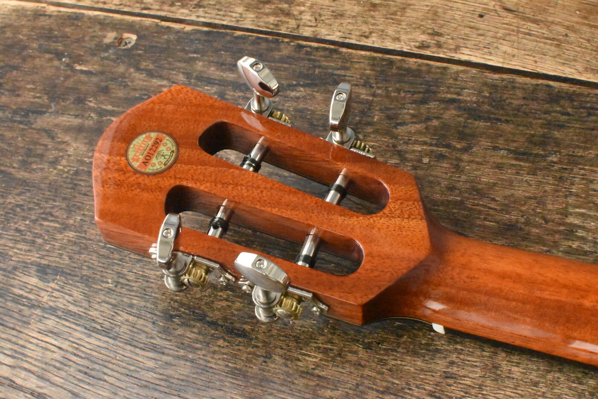 スロテッドヘッドのペグはオリジナルのギア式を採用しチューニングも快適。aNueNueオリジナルのGreen Planetフロロカーボン弦が標準装備されています。