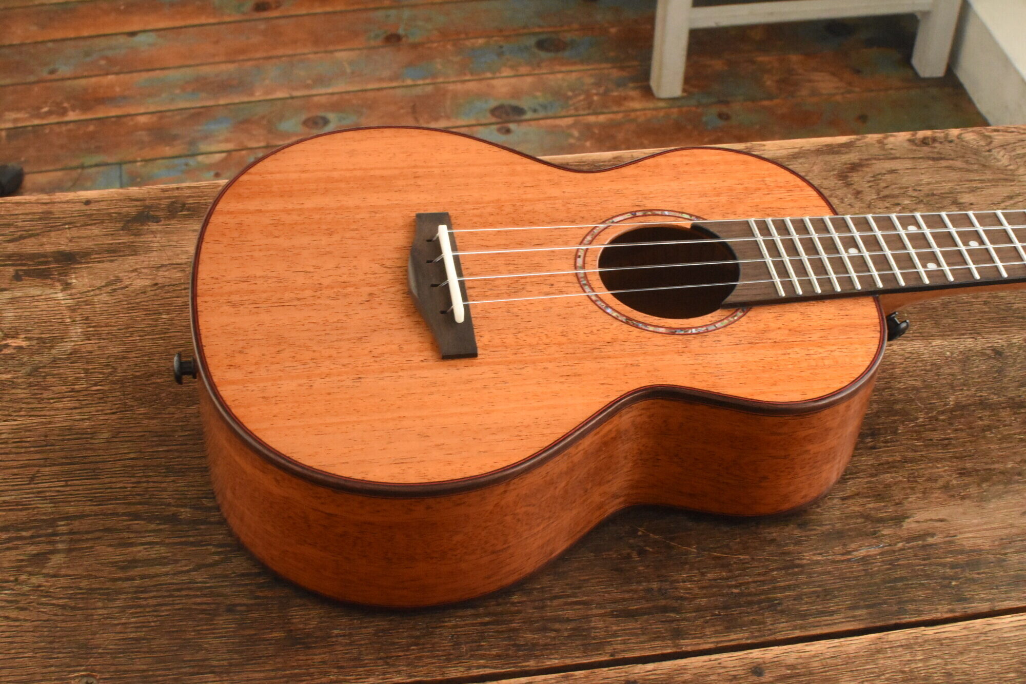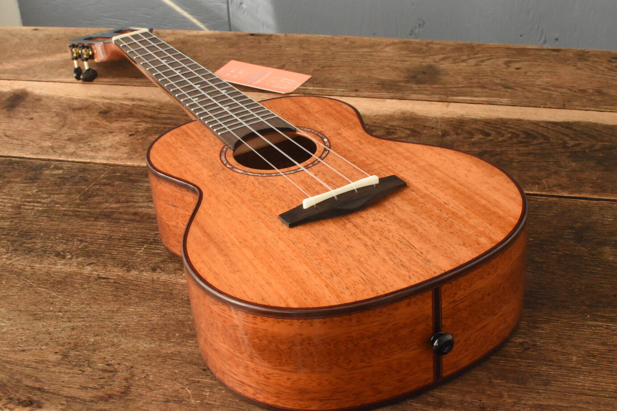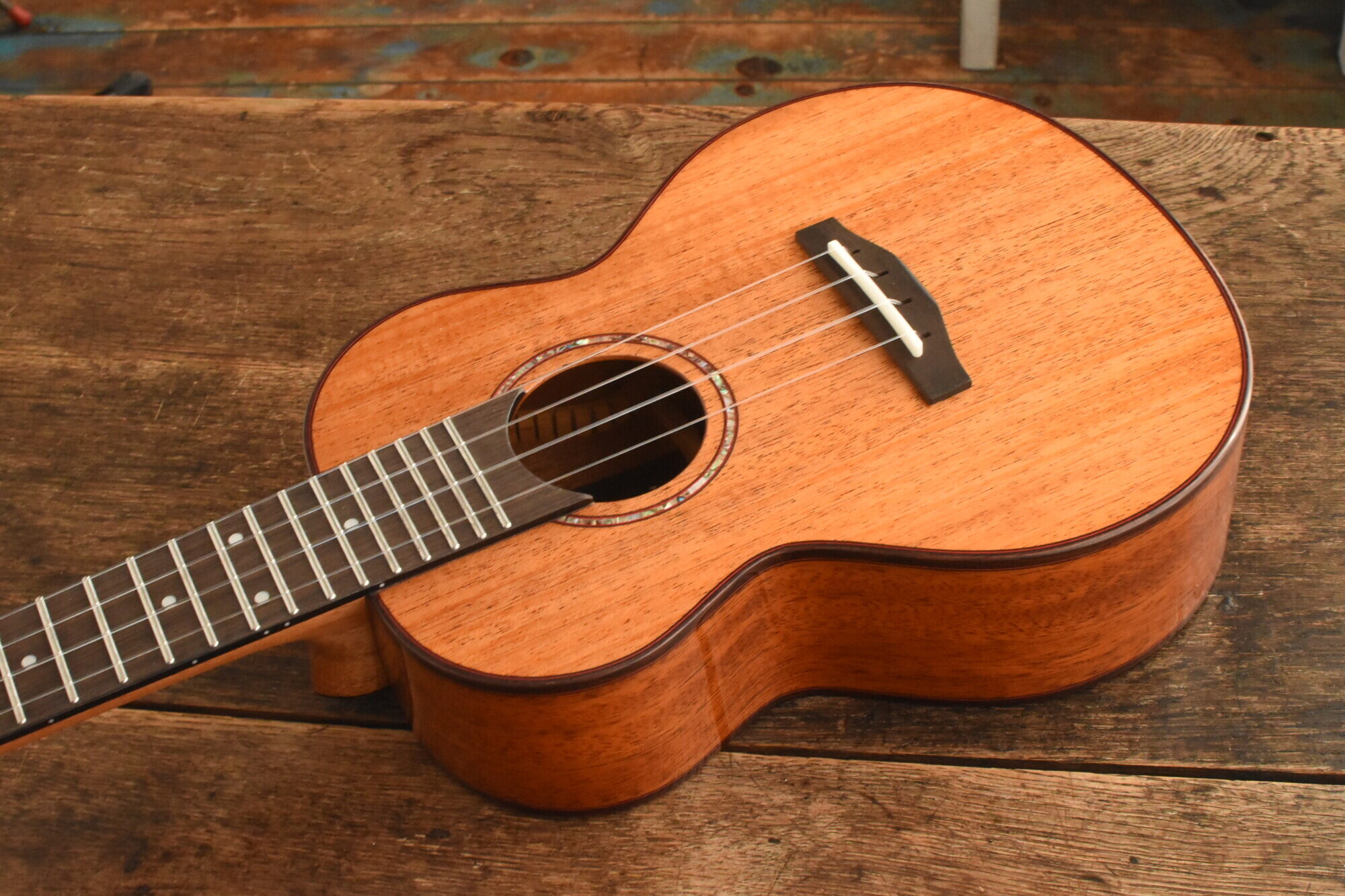 ボディにはアフリカンマホガニー単板を使用。ネックにはオクメ、指板&ブリッジにはローズウッドを使用しています。