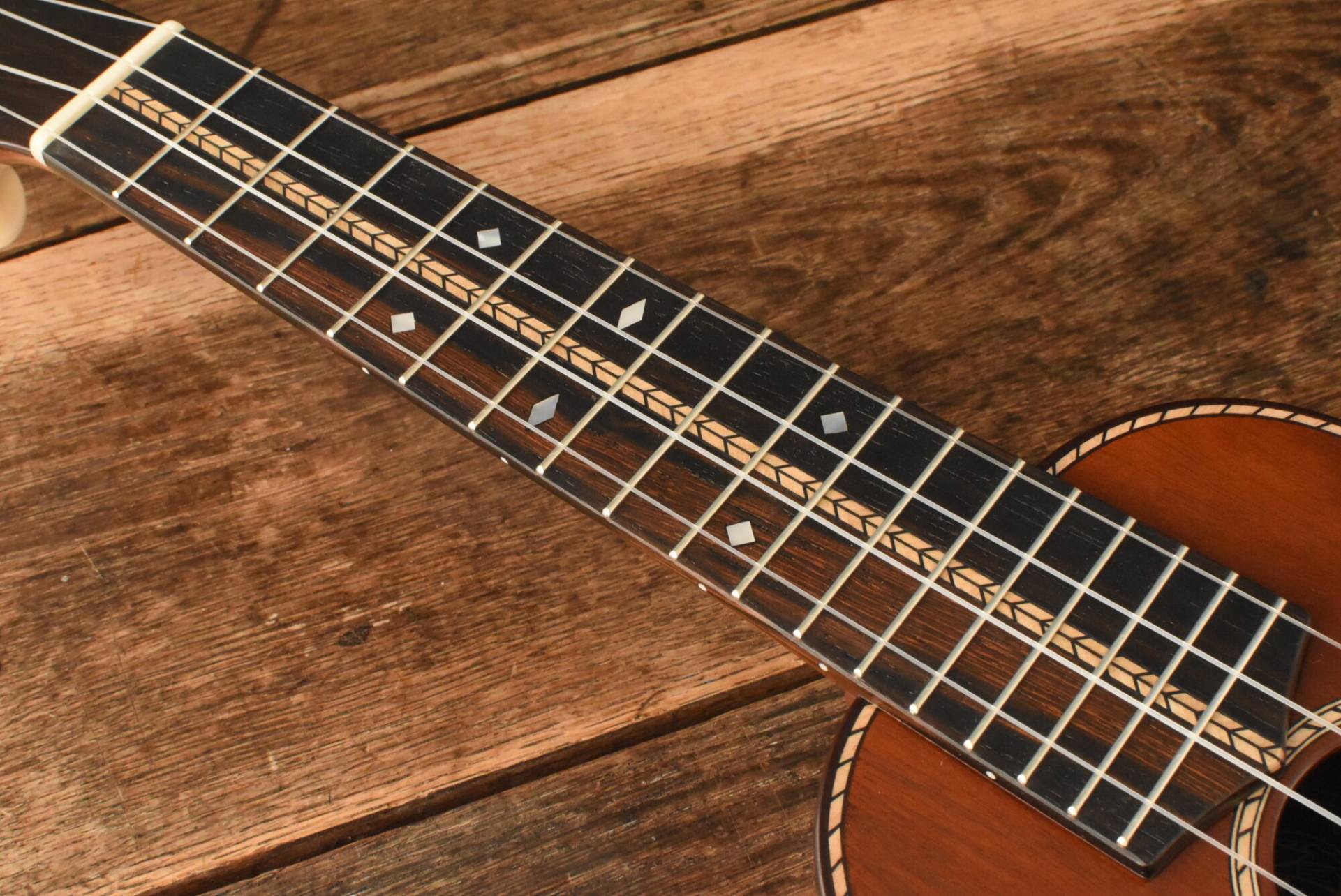 ボディトップ&バックのバインディングにはマダガスカルローズウッド、ボディパーフリング&ロゼッタ&指板センターにはオリジナルデザインのロープ柄、指板には白蝶貝を使ったスクエア&ダイヤモンドポジションマーク、ブラジリアンローズのヘッド突板など、アンティーク材の美しさをさらに引き立たせる大変美しい装飾が施されています。