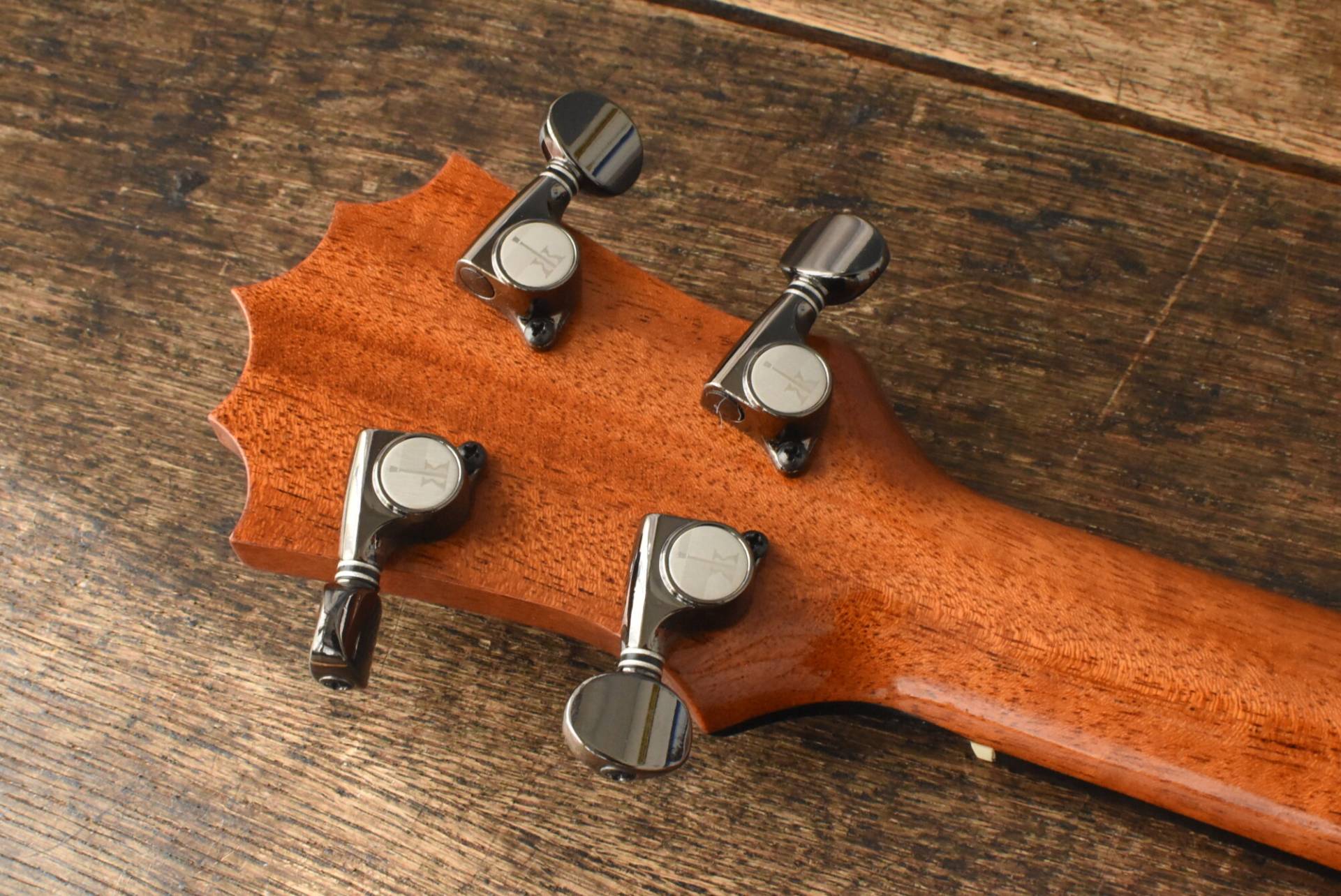 独特の形状のクラウンヘッド、ヘッド突板にもエボニー、ヘッドのロゴインレイ&指板ポジションマークにはパウア貝、コアロハのロゴ入りのオリジナルギアペグを使用するなど、ブランドを象徴する個性的な外観が特徴。ボディ内部のラベルもシリアルの入った25周年仕様となっております。