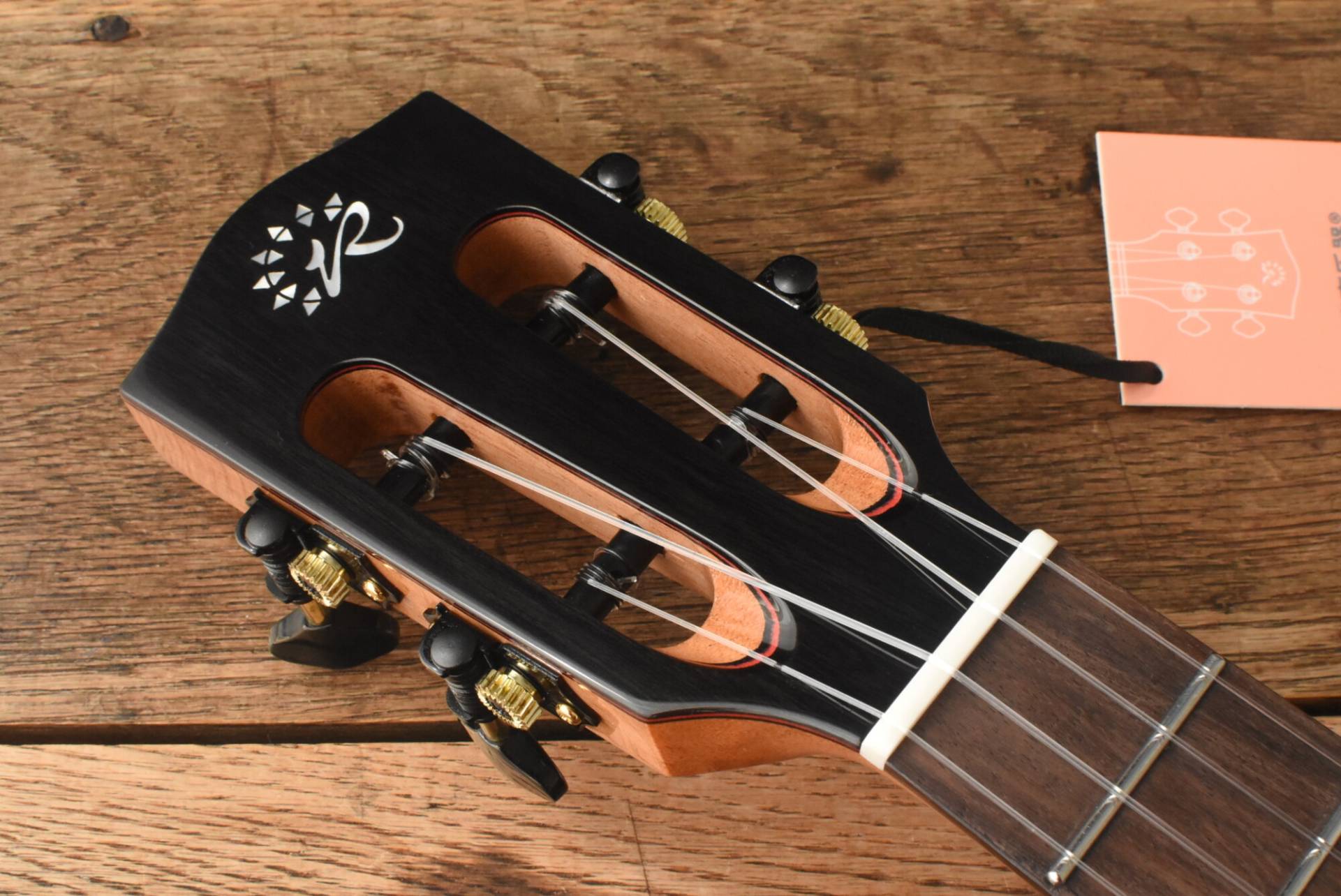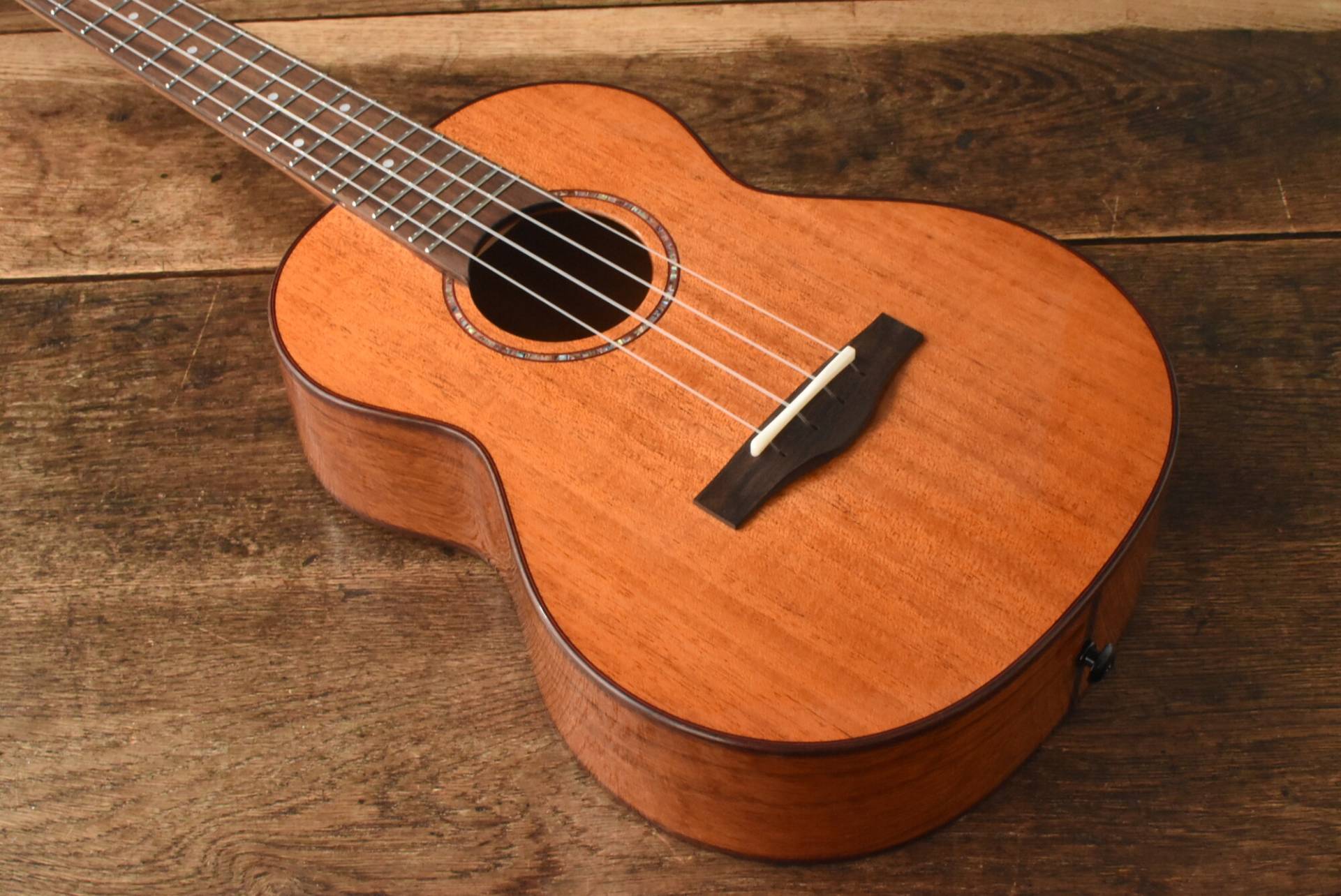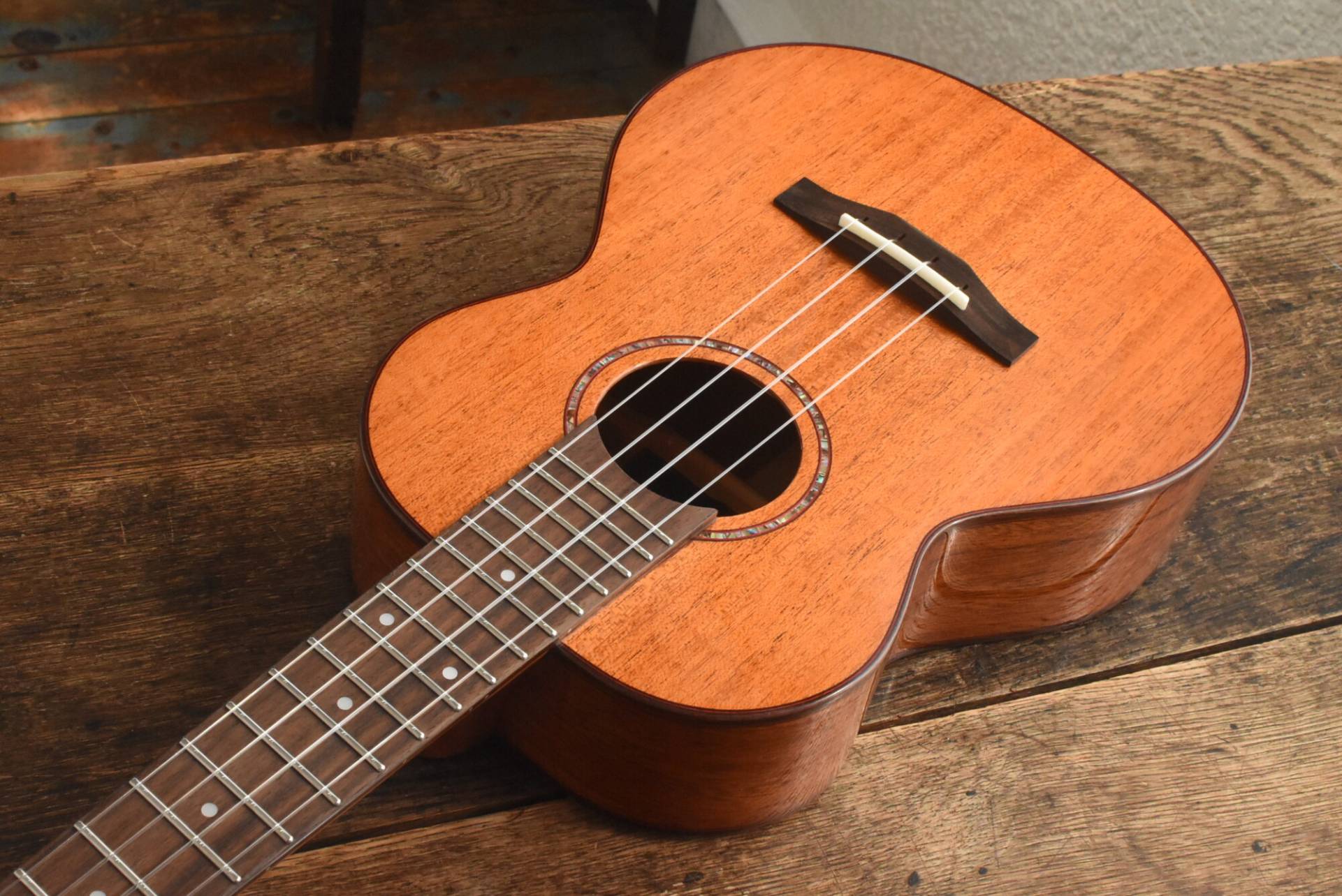 テナーサイズならではの豊かなサステインと、柔らかで温かなマホガニーサウンドが特徴。音量も申し分ありません。太めのフレット採用により押弦もしやすく、演奏性も良好です。ストラップピン2箇所が標準装備ですので、2点式ストラップもすぐにご利用頂けます。