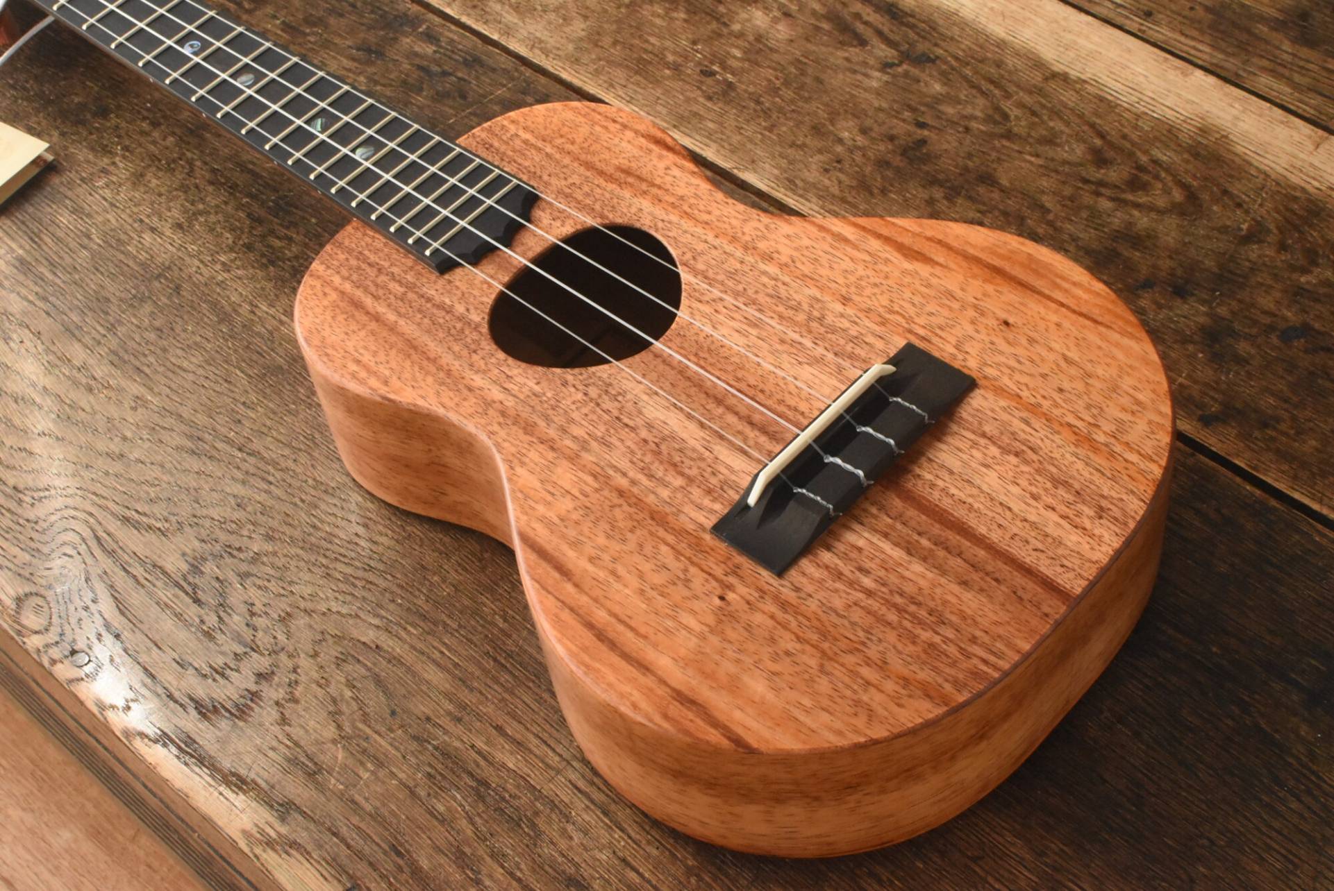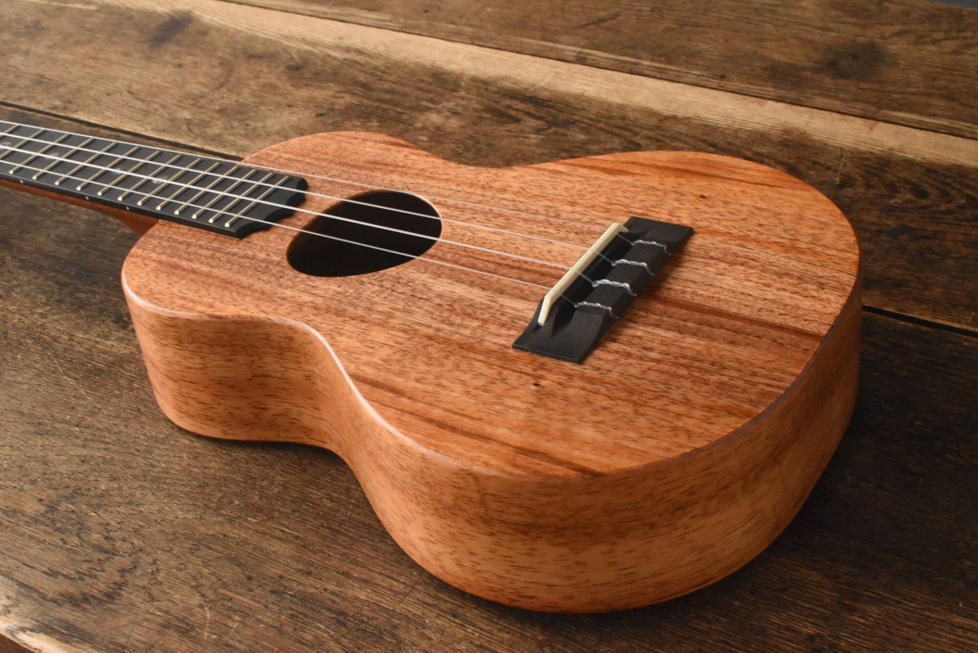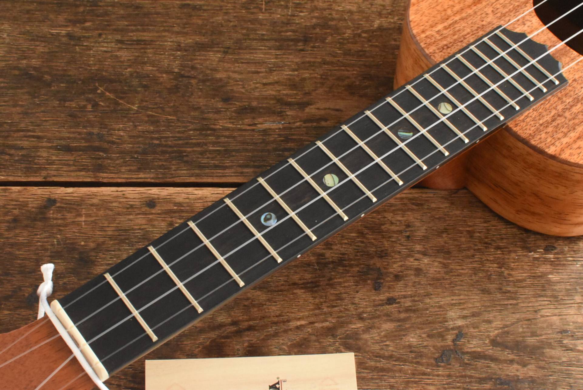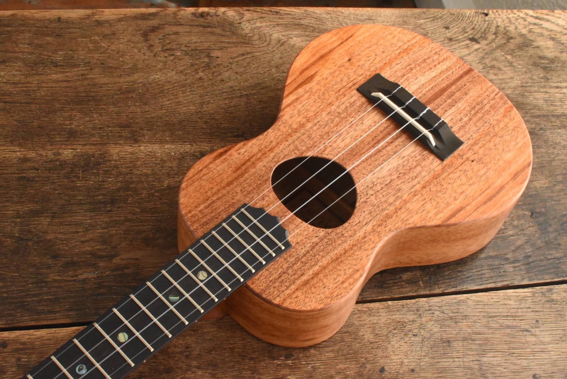 ボディには美しい木目のハワイアンコアを使用。エボニー指板&ブリッジ、マホガニーネック。