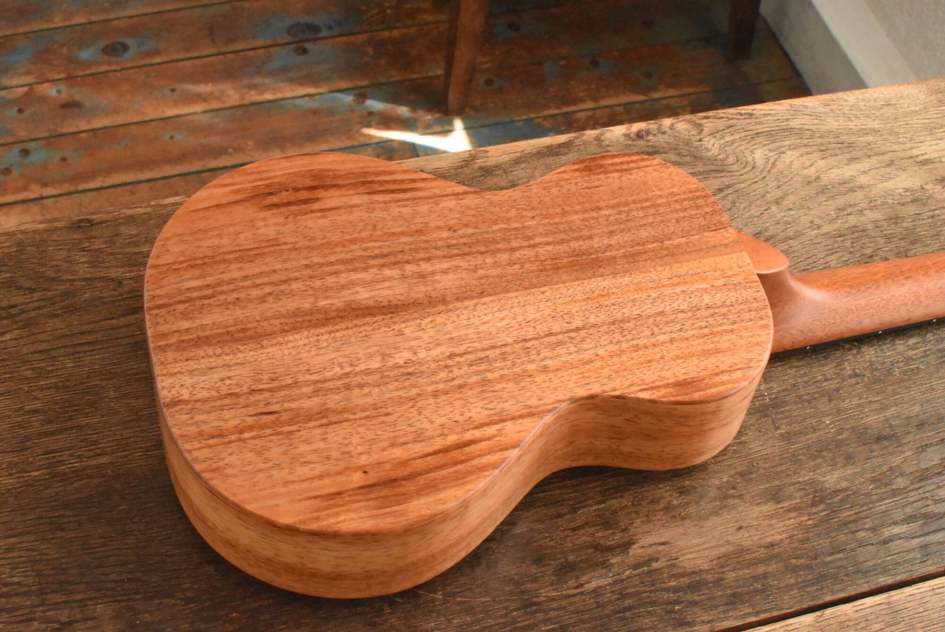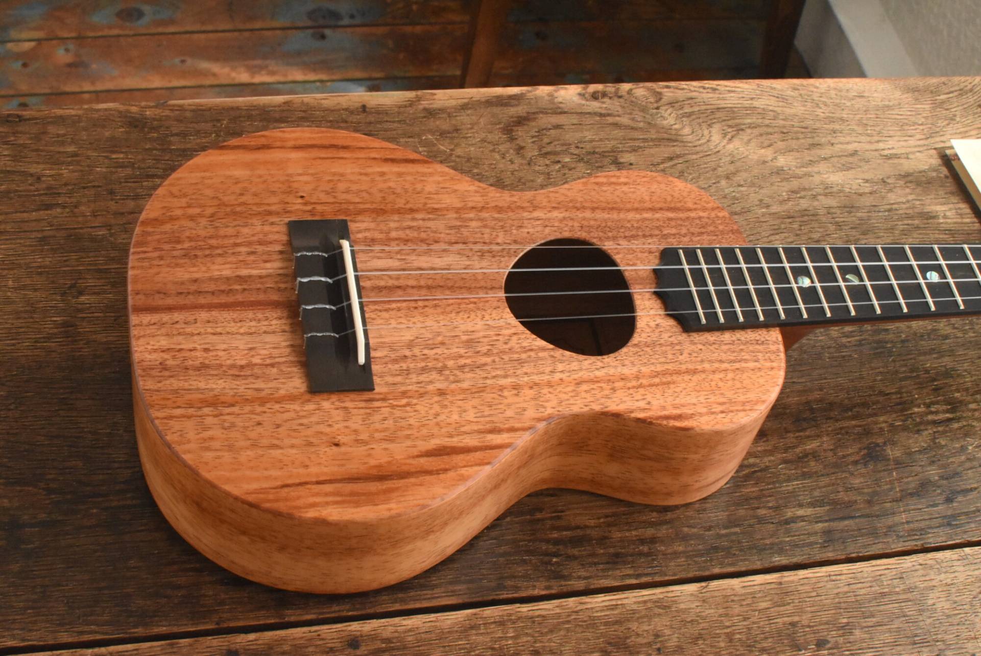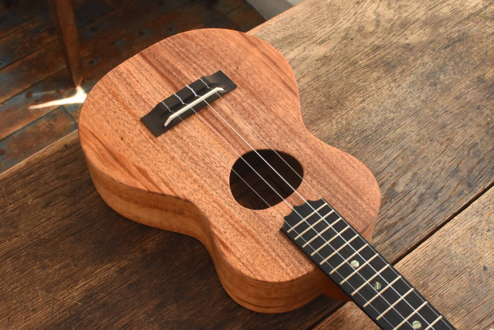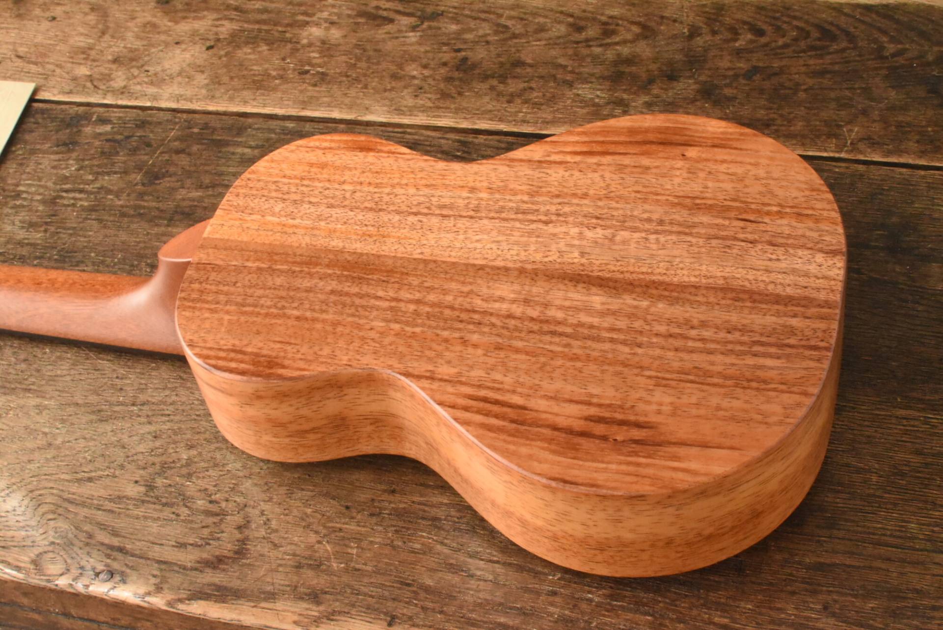 ボディには美しい木目のハワイアンコアを使用。エボニー指板&ブリッジ、マホガニーネック。